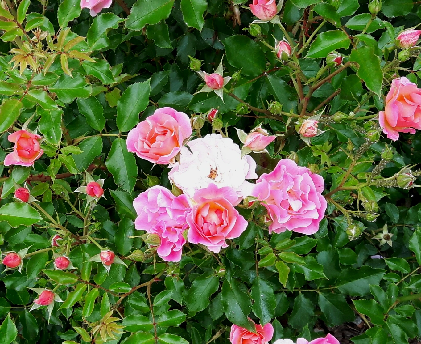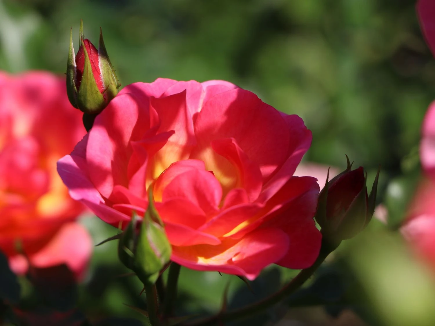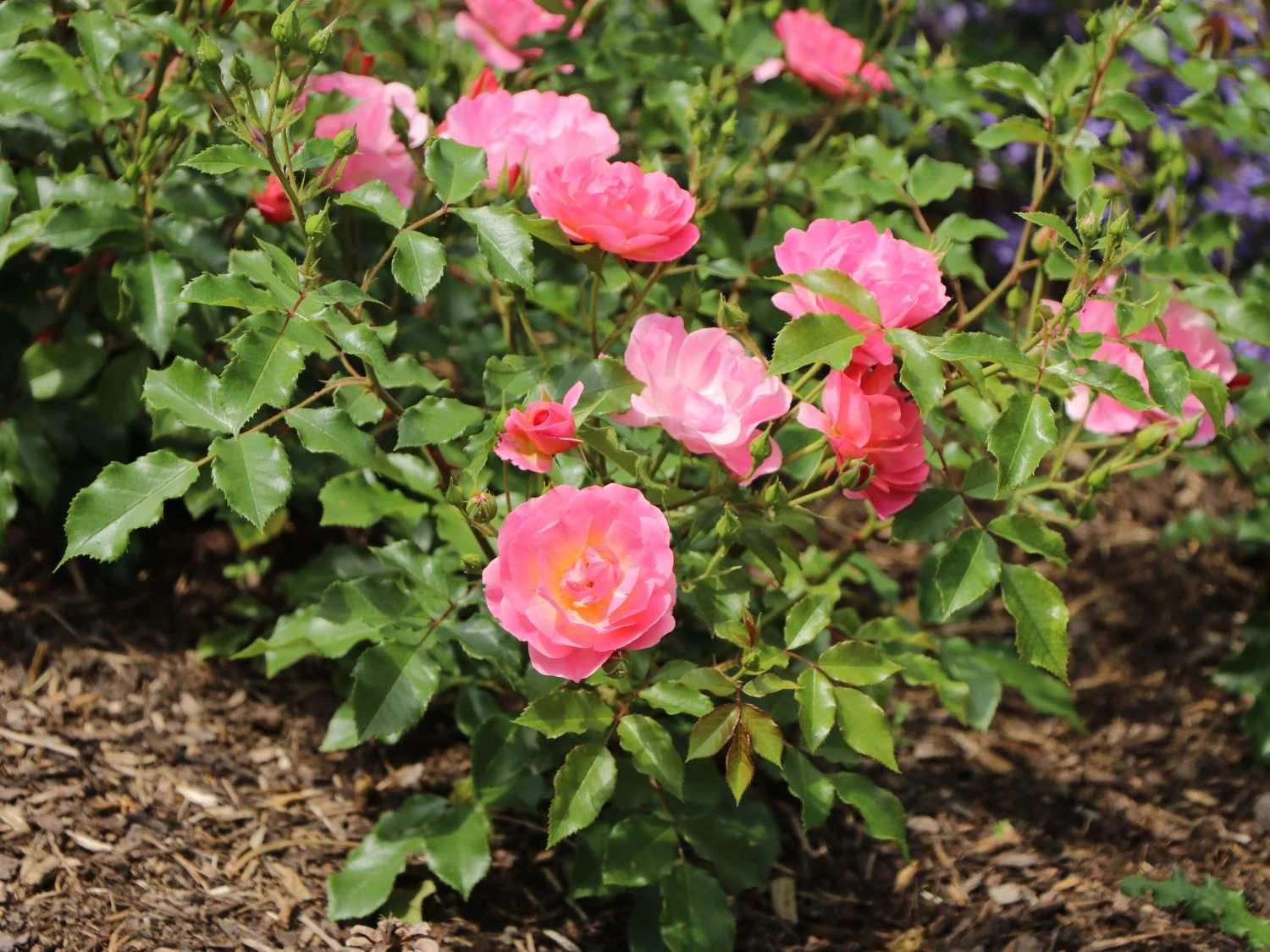 Die Beetrose / Bodendecker-Rose ‚Maxi Vita‘ ® hat sich mit ihrem niedrigen Wuchs und dem kräftigen Laub an unterschiedlichen Standorten bewährt und verschiedene Gartenschauen bereichert. Ab Juni bildet sie Blütenknospen, die sich zu einer lockeren Schalenblüte mit mehrfachen, kreisförmig angeordneten und gewellten Blütenblättern entfalten. Orangerosa leuchten die inneren Blütenblätter, die von rein rosa Blättern umschlossen sind. Ein Kranz gelb und dunkelbraun gefärbter Staubgefäße bilden die Blütenmitte. Das Farbenspiel wiederholt sich wochenlang an jeder Blüte und macht die Sorte zur Attraktion. Ihre Blüten sitzen in Tuffs am Ende der Zweige und ergeben einen wunderschönen Rosenstrauß. Gärtner setzen die Beetrose / Bodendecker-Rose ‚Maxi Vita‘ ® in ein Schnittblumenareal und ernten bis in die Herbstmonate zauberhafte Rosen. Gartenlose Rosenfreunde geben der Beetrose / Bodendecker-Rose ‚Maxi Vita‘ ® einen tiefen Kübel mit guter Kübelpflanzenerde. Sie freuen sich über eine gelungene und lang anhaltende Blütendekoration auf Balkon und Terrasse. Rosa ‚Maxi Vita‘ ® wächst mit kräftiger Wurzel in nährstoffreichem, gut drainiertem und tiefgründigem Boden. In Staunässe und verfestigtem Boden gedeiht sie nicht. Sie verträgt kleine Anteile Kalk, toleriert Sand, übersteht Hitzephasen gut und gedeiht in trockener Stadtluft. Raue Winde, Regen und feuchte Winter quittiert sie mit Blütensegen. Gärtner suchen einen luftigen, sonnigen Standort aus, der in den Mittagsstunden in dünnem Schatten liegt. Im Frühjahr erhält der Strauch Kompost, Kübelpflanzen bekommen Dünger. Im Freiland hält eine Schicht Mulch die Feuchtigkeit in der Erde. Der Strauch wächst locker, mit ähnlicher Höhe und Breite und erfordert keinen regelmäßigen Schnitt. Gartenfreunde beseitigen beschädigte Triebe zu jeder Zeit und kürzen lange Zweige im Frühjahr. Die Beetrose / Bodendecker-Rose ‚Maxi Vita‘ ® ist winterhart. Rosenfreunde begeistern sich für die malerischen Blüten und erfreuen sich viele Jahre an einem prächtigen Strauch.