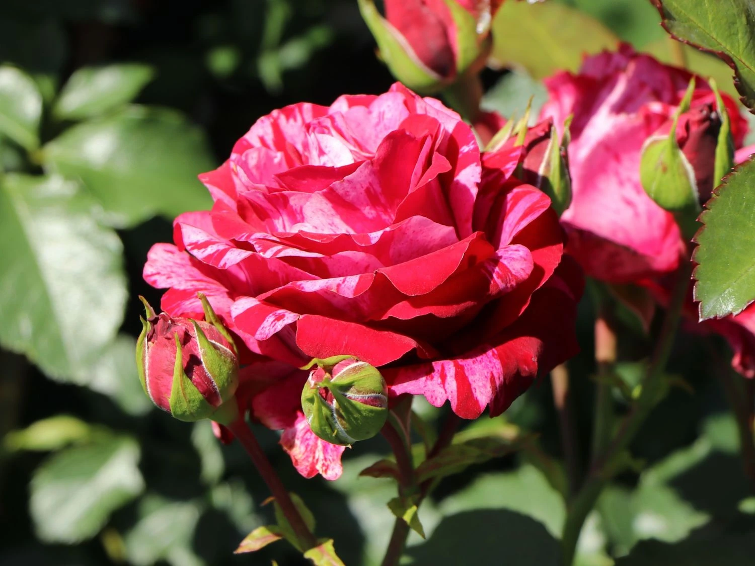 Die Beetrose ‚Deep Impression ®‘ setzt in jedem Garten einen besonderen farblichen Akzent. Die mittelgroßen, halbgefüllten Blüten der Pflanze bezaubern durch ihren dunkelroten Farbton, der wiederum mit pinken Streifen durchsetzt ist. Die Blütenköpfe sind in dunkelgrünes, glänzendes Laub eingebettet. Beides steht in einen schönen Kontrast zueinander. Die Beetrose ‚Deep Impression ®‘ verströmt einen leicht fruchtigen Duft, der an reife Himbeeren erinnert. Rosa ‚Deep Impression ®‘ blüht in der Zeit von Juni bis Oktober. Sie ist eine öfterblühende Sorte und erfreut durch den ganzen Sommer mit ihrer Blütenpracht. Das Entfernen verwelkter Blüten fördert das Wachstum neuer Blüten. Die Früchte der Beetrose sind Hagebutten. Diese haben einen süßlichen Geschmack und dienen Vögeln als winterliche Nahrungsquelle.