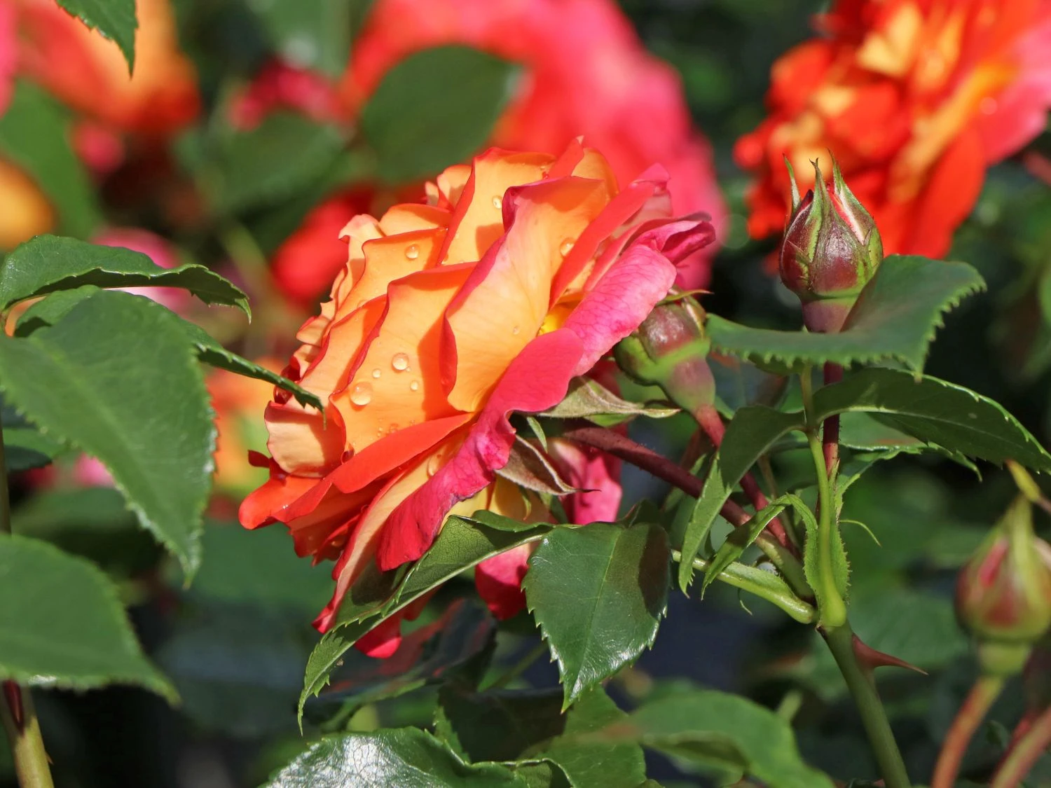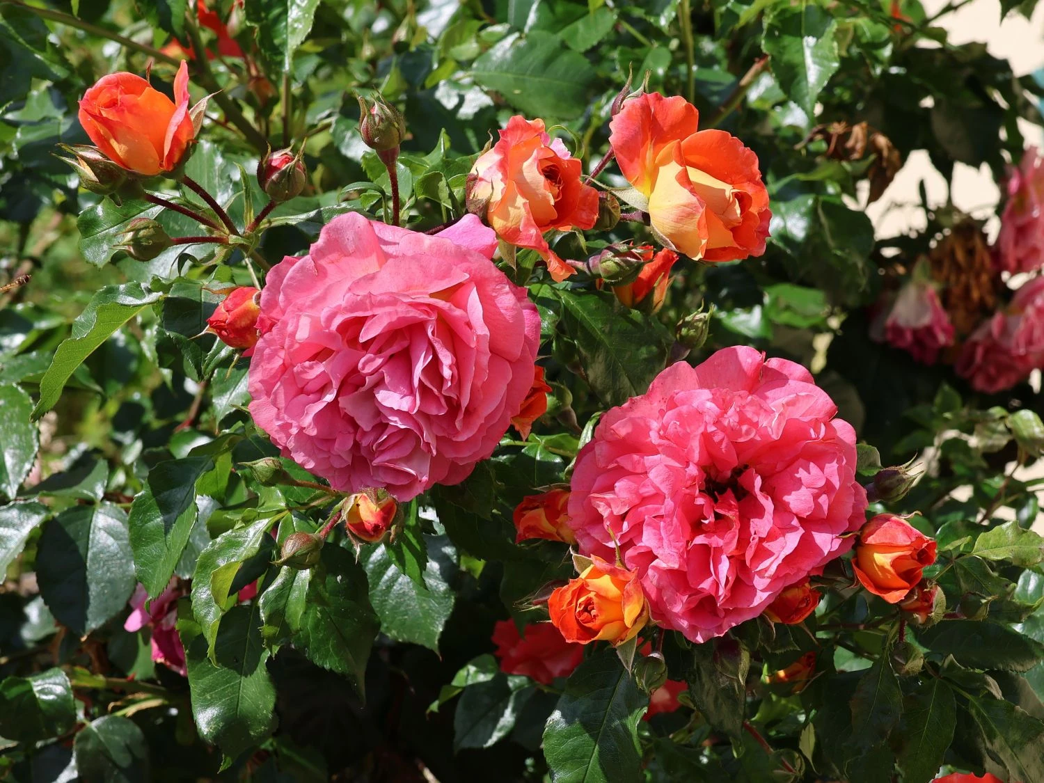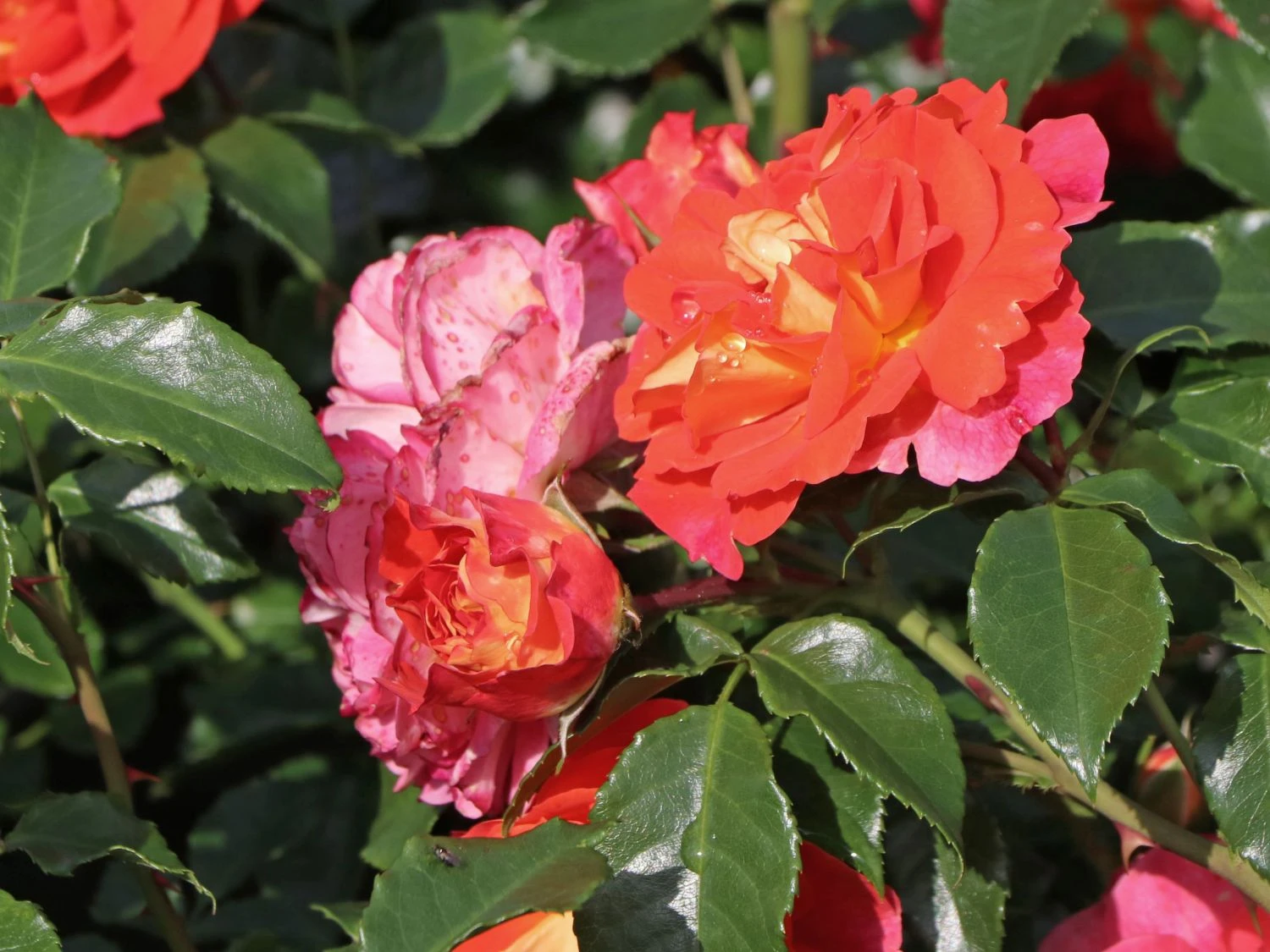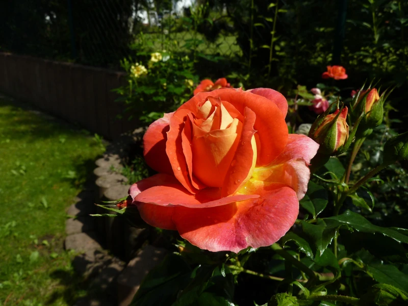 Die Beetrose ‚Gebrüder Grimm‘ ® / Joli Tambour begeistert mit ihrem farbenfrohen Blütenspiel. Es changiert von gelb-orange über rosa bis pink. Die (bot.) Rosa ‚Gebrüder Grimm‘ ® / Joli Tambour ist eine Kreation aus dem Jahr 2002 von Wilhelm Kordes & Söhne. Die Beetrose trägt das ADR-Prädikat und zeichnet sich durch Farbintensität, Blattgesundheit und Wuchskraft aus. Die Märchenrose blüht zwischen Juni und September. In dieser Zeit präsentiert sie sich von ihrer schönsten Seite. Die Blüten stehen in Dolden an den kräftigen Trieben. Die Beetrose ‚Gebrüder Grimm‘ ® / Joli Tambour schmückt sich mit gefüllten Blüten und verströmt einen harmonischen Duft. Ihre Blütenfülle ist beeindruckend. Jede einzelne Blüte wird bis zu zehn Zentimeter groß und nimmt es mit jeder Edelrose an Eleganz und Leuchtkraft auf. Rosa ‚Gebrüder Grimm‘ ® / Joli Tambour ist eine Kostbarkeit. Sie wächst aufrecht und buschig und erreicht eine Wuchshöhe von bis zu 80 cm. Der Wuchs dieser Rose ist aufrecht und ihre Triebe hängen leicht herunter.