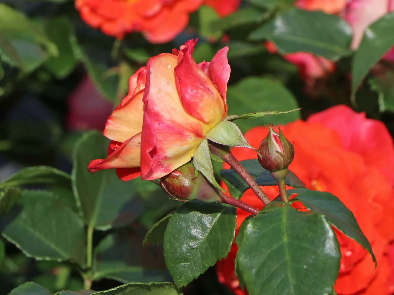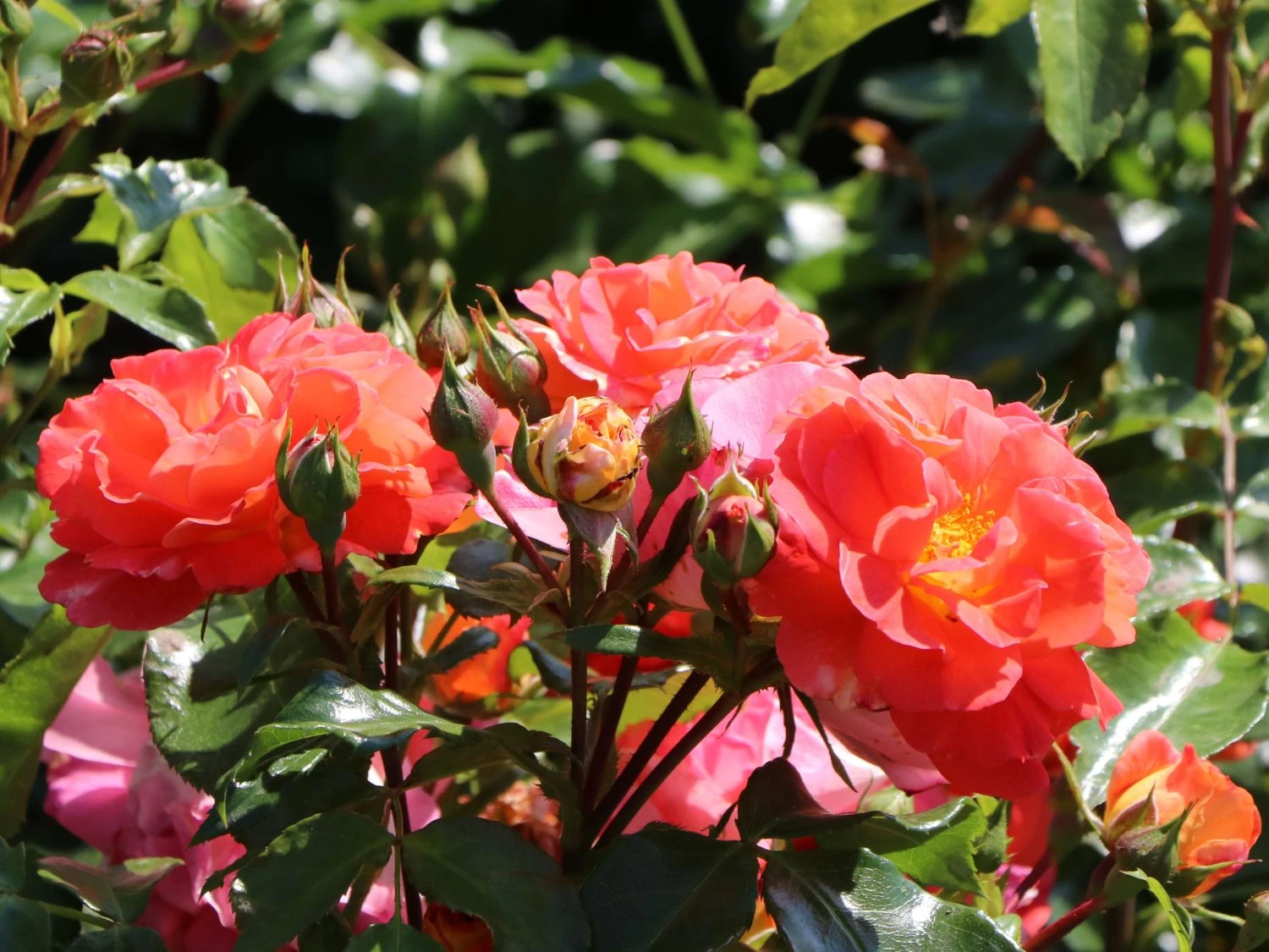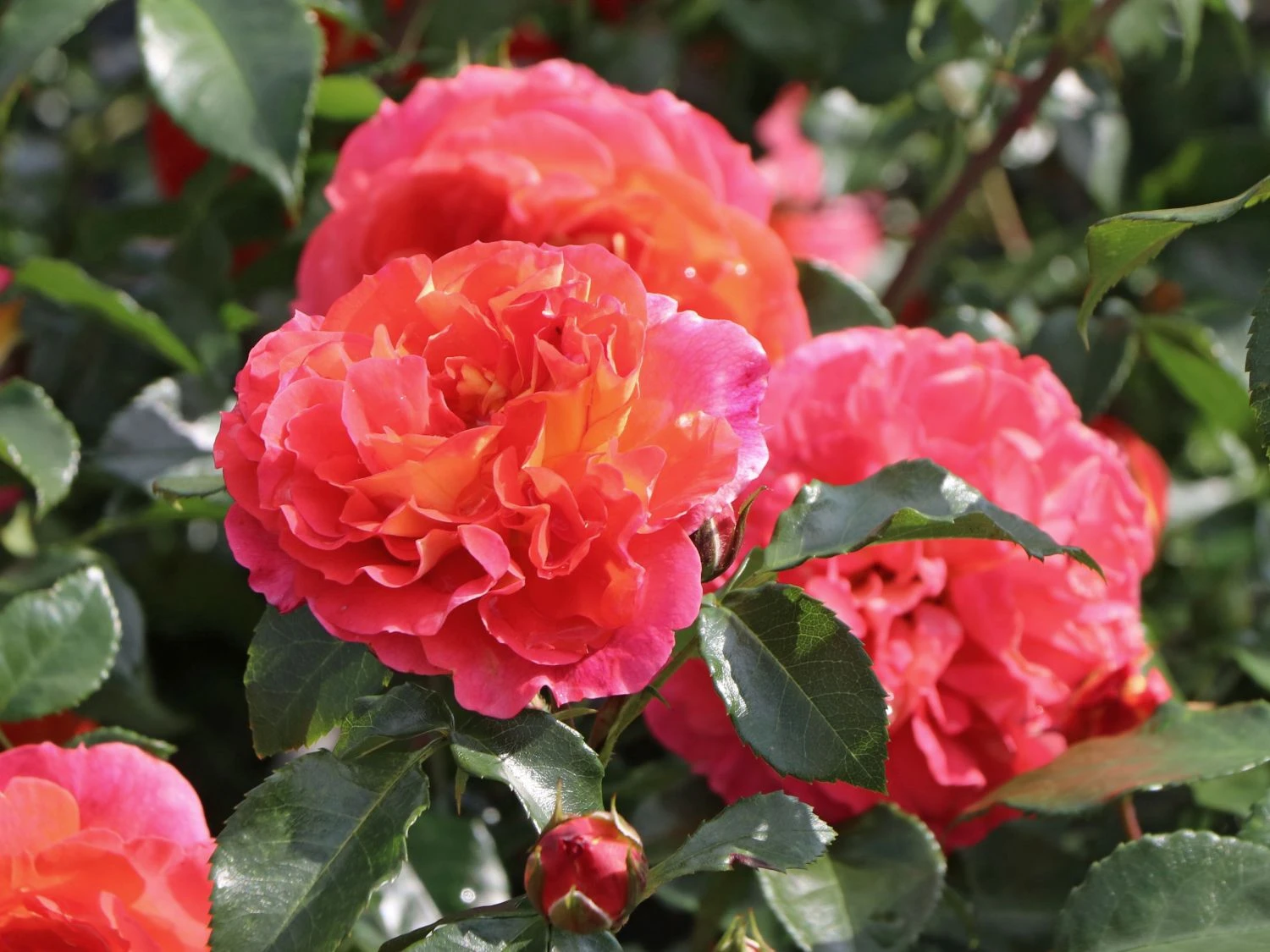 Die Beetrose ‚Gebrüder Grimm‘ ® / Joli Tambour begeistert mit ihrem farbenfrohen Blütenspiel. Es changiert von gelb-orange über rosa bis pink. Die (bot.) Rosa ‚Gebrüder Grimm‘ ® / Joli Tambour ist eine Kreation aus dem Jahr 2002 von Wilhelm Kordes & Söhne. Die Beetrose trägt das ADR-Prädikat und zeichnet sich durch Farbintensität, Blattgesundheit und Wuchskraft aus. Die Märchenrose blüht zwischen Juni und September. In dieser Zeit präsentiert sie sich von ihrer schönsten Seite. Die Blüten stehen in Dolden an den kräftigen Trieben. Die Beetrose ‚Gebrüder Grimm‘ ® / Joli Tambour schmückt sich mit gefüllten Blüten und verströmt einen harmonischen Duft. Ihre Blütenfülle ist beeindruckend. Jede einzelne Blüte wird bis zu zehn Zentimeter groß und nimmt es mit jeder Edelrose an Eleganz und Leuchtkraft auf. Rosa ‚Gebrüder Grimm‘ ® / Joli Tambour ist eine Kostbarkeit. Sie wächst aufrecht und buschig und erreicht eine Wuchshöhe von bis zu 80 cm. Der Wuchs dieser Rose ist aufrecht und ihre Triebe hängen leicht herunter.