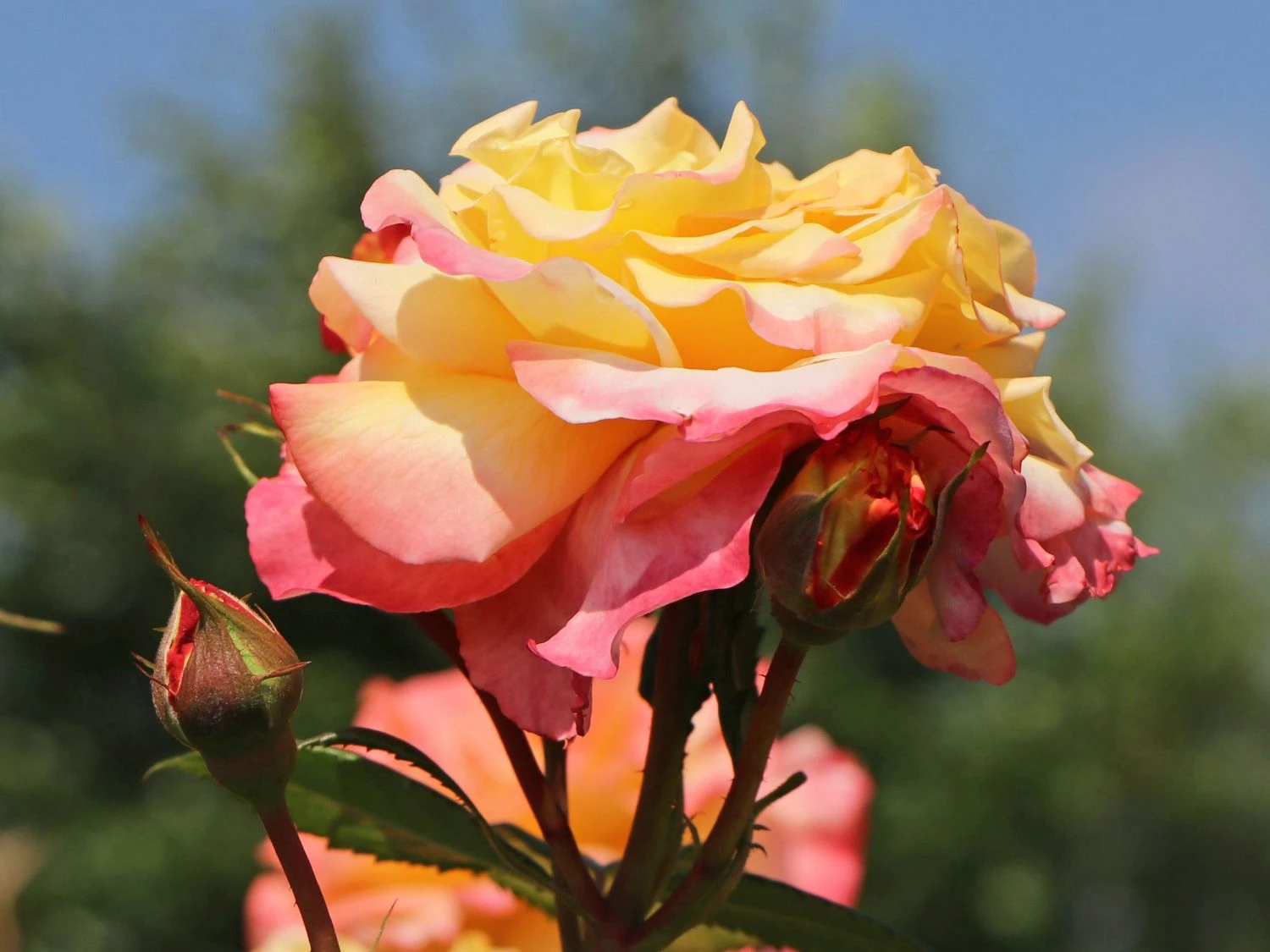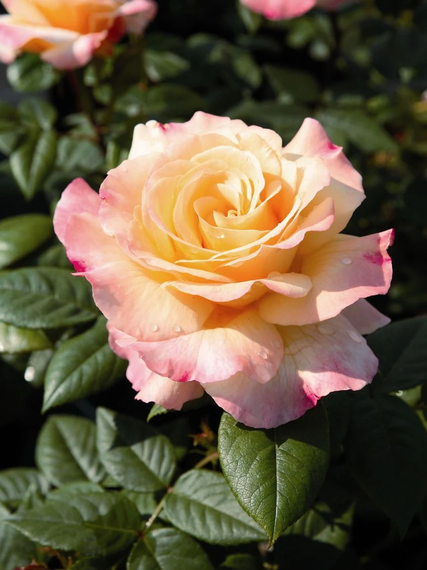 Die Edelrose ‚Aquarell‘ ® verfügt über besonders langstielige Blüten. Die großen, gut gefüllten Blüten erstrahlen in einem lebendigen Pfirsichgelb, das nach außen hin zu einem zarten Hellgelb verblasst. Die äußeren Blütenblätter der Rosa ‚Aquarell‘ ® sind wie gemalt mit roten Farbakzenten überzogen. Der elegante Effekt dieses Farbenspiels wird durch das dunkelgrüne, glänzende und dichte Laub noch unterstrichen. Der süße, fruchtige Duft der Edelrose ‚Aquarell‘ ® ist außergewöhnlich intensiv.