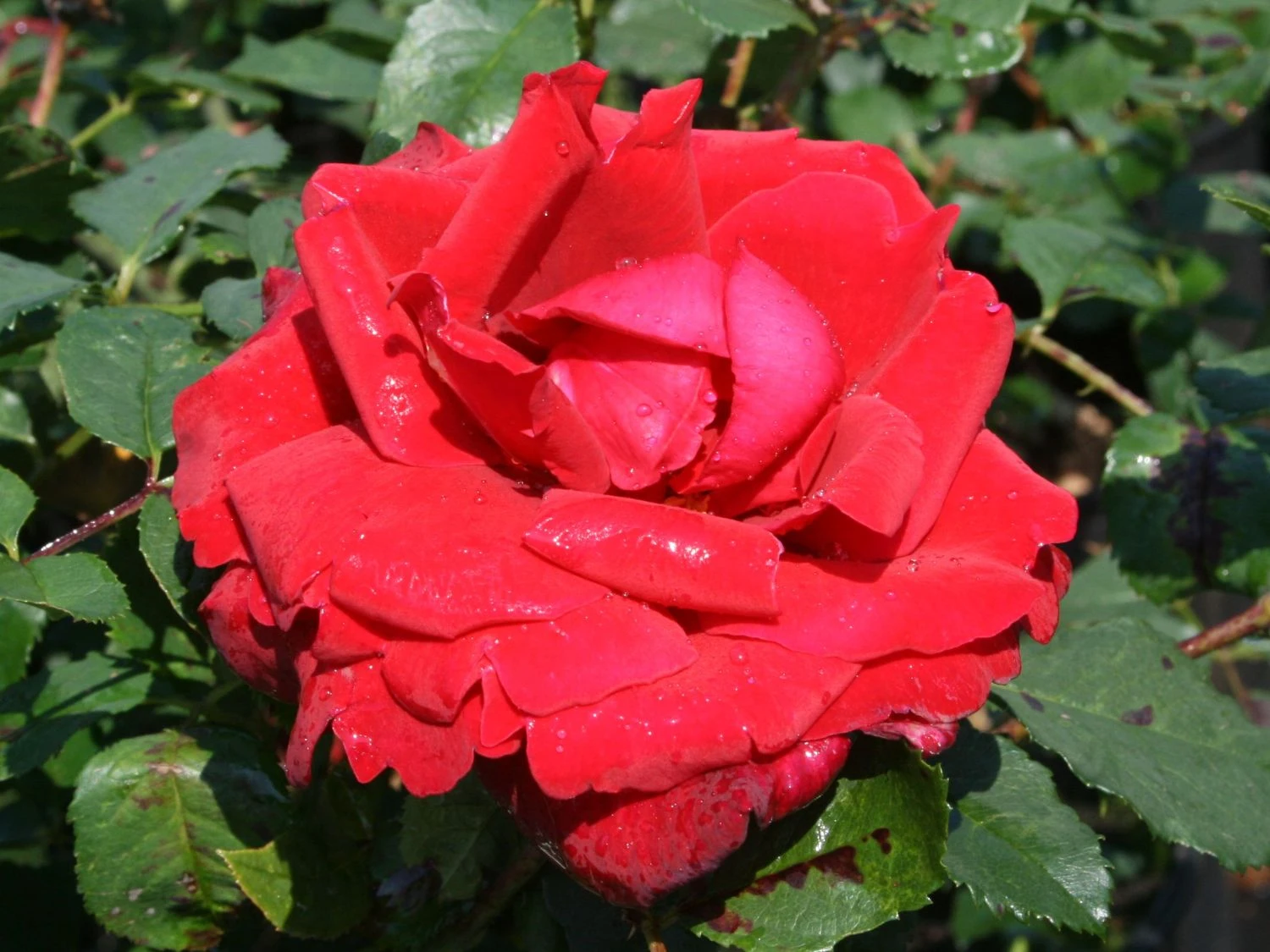 Die Edelrose ‚Duftzauber 84‘ ® zählt mit ihren tiefroten gefüllten Blüten zu den schönsten Edelrosen. Die großen, leuchtend roten Blüten verfügen über eine perfekte Form und bestechen mit ihrem großartigen Duft. Ihr intensives Rot erhält durch das kräftige, glänzende Grün ihres Blattwerks einen markanten Farbkontrast. Wohl niemand wundert sich darüber, dass (bot.) Rosa ‚Duftzauber 84‘ eine Diva unter den zahlreichen Edelrosen darstellt. Die wunderschöne Edelrose ‚Duftzauber 84‘ ® ist eine Teehybride. Diese gehen auf das Kreuzen chinesischer Teerosen und Remontant-Rosen aus Europa im 19. Jahrhundert zurück. Seitdem lassen sie das Herz eines jeden Rosenfreundes höher schlagen. ‚Duftzauber 84′ ® stammt aus dem Jahr 1984 und ist eine gezüchtete Sorte des bekannten Rosenunternehmens W. Kordes‘ Söhne. In Großbritannien ist die öfter blühende Edelrose unter dem Namen Royal William bekannt, in Dänemark hat sie als Leonora Christine unzählige Verehrer. Was für ein Duft von den dunkelroten Blüten ausgeht! Wenn sich die eleganten rötlichen Knospen im Juni öffnen, entströmt den dicht gefüllten großen Blüten ein wunderbares, intensives Aroma. Die mehr als zehn Zentimeter großen Blüten sind gefüllt. Sie wachsen an langen Stielen und sind im Rosenbeet und in der Vase ein markanter Hingucker. Die Blüten stehen entweder einzeln oder zu mehreren an den dicktriebigen Stielen.