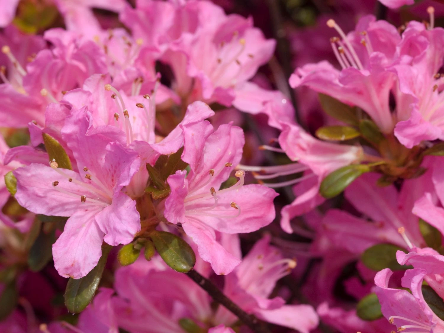 Japanische Azalee ‚Diamant Rosa‘ ® – wohl die schönste unter den ‚Diamant‘-Züchtungen. Die Blüten im leuchtenden Reinrosa weisen in ihrem Inneren eine kleine rötliche Zeichnung auf, seine Staubblätter ragen weit heraus.