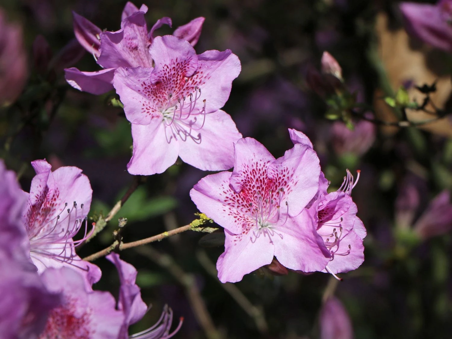 Japanische Azalee ‚Ledikanense‘ – Lila sind so einige Sorten, aber dieses spezielle Hell-lila bringt nur diese eine mit. Die weinrote Zeichnung erstreckt sich über drei innere Blütenblätter. Sie ist außerdem sehr reich blühend.