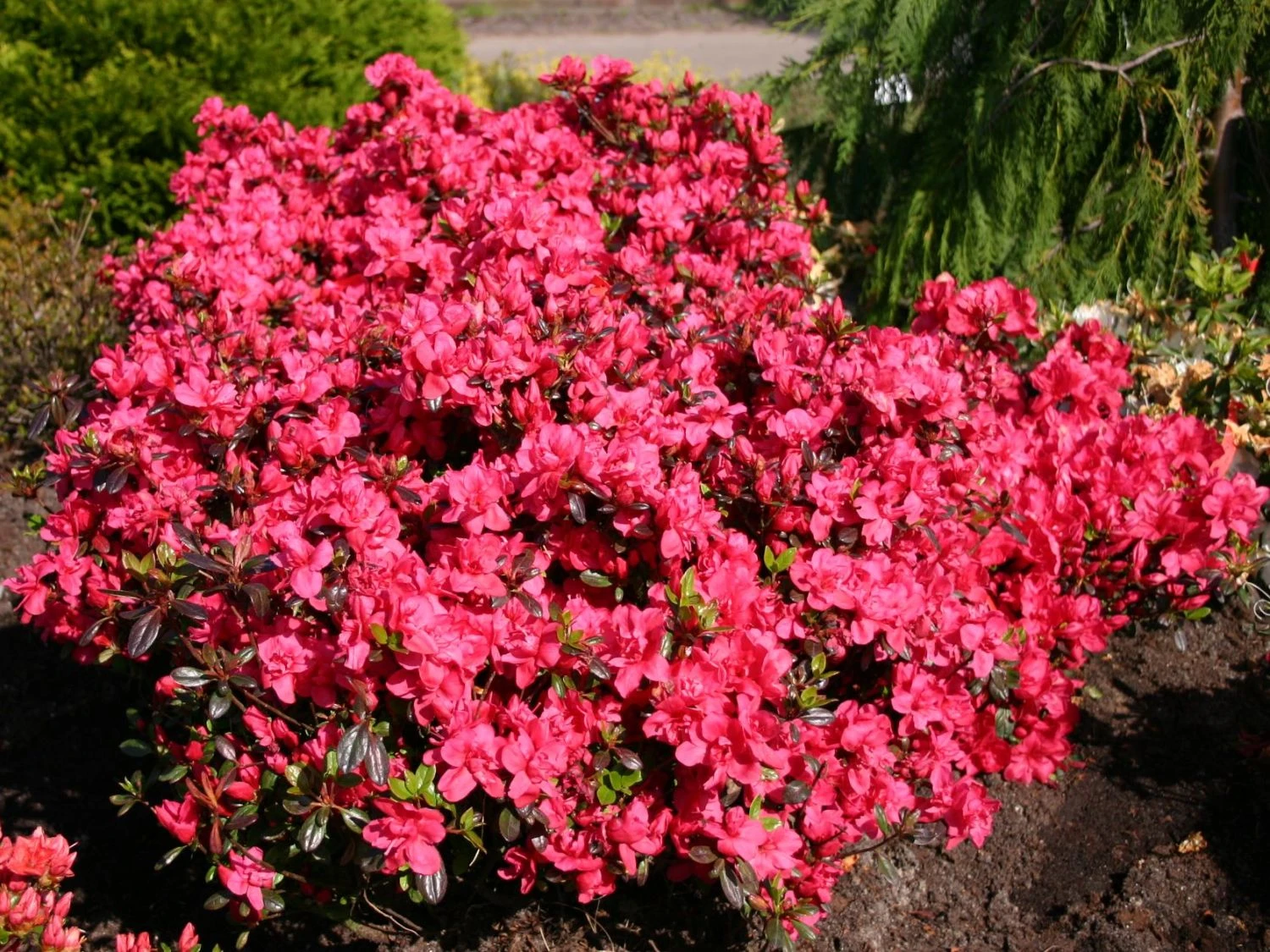 Die Japanische Azalee ‚Maraschino‘ ® entfaltet ab Anfang Mai ihre Knospen. Ab da verwandelt sich der Strauch in eine weithin leuchtende, karmesinrote Blütenkugel. (Bot.) Rhododendron obtusum ‚Maraschino‘ ® ist ein zwergenhafter Strauch und breitet seine dicht verzweigten Äste aus. Blattknospen und junge Blätter wirken im zeitigen Frühjahr wie dunkle Schokolade. In den nächsten Wochen färben sie sich in ein leuchtendes Grün und geben an allen Zweigspitzen Dolden mit Blütenknospen frei. Täglich öffnen sich neue Blüten und verlängern die Blühphase bis Ende Juni. Ideal eignet sich die Japanische Azalee ‚Maraschino‘ ® für einen einen Steingarten, in den sie zwischen Felsen, niedrigen Zypressen und Heidegewächsen intensive Farbe bringt. Der Zierstrauch wächst 40 Zentimeter in die Höhe 50 Zentimeter in die Breite.