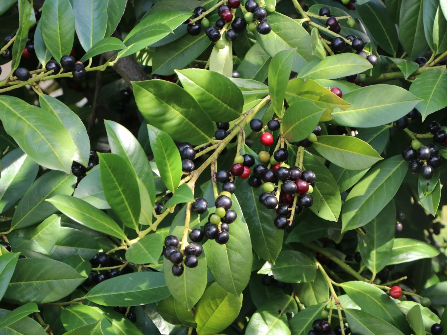 Wenn die Insekten fleißig waren, dann bilden sich Ende Juni langsam die Früchte der Pflanze heraus. Sie schmücken die Lorbeerkirsche ‚Rotundifolia‘ vom Spätsommer bis in den Herbst hinein. Ihr Antlitz ist als rundlich bis kegelförmig zu definieren. Jede einzelne Frucht wird etwa 1 Zentimeter lang. Zu Beginn sind die kleinen Früchte, die wie Beeren wirken, grün. Dann verwandelt sich die Farbe in ein Gelb, Orange, Rot, um schließlich in der Reife der Früchte mit einem Violettschwarz zu überzeugen. Diese dunklen Beeren sind typisch für den Kirschlorbeer. Auch wenn sie sehr attraktiv wirken, sollten sie nicht vom Menschen verzehrt werden. Stattdessen können die vielen Früchte als Nahrung für Vögel und Mäuse dienen oder als Dekoration im Herbst.