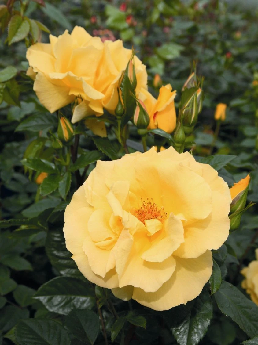 Die Kletterrose ‚Dukat‘ ® ist eine besonders bezaubernde Sorte. Mit ihren strahlend dunkelgelben Blüten entzückt sie Sonnenanbeter wie Rosenliebhaber. Die halbgefüllten, doldenförmigen Blüten werden bis zu 10 cm groß und erfreuen mit einer langen Blütezeit von Juni bis Oktober. Sie verströmen einen wunderbar süßlich-fruchtigen Duft. Einen schönen, farblichen Kontrast bilden die dunkelgrünen, 5-fach gefiederten, eiförmigen Blätter, die vor dem Winter zu Boden fallen. Die Rosa ‚Dukat‘ ® wächst aufrecht-buschig bei einer Höhe von bis zu 3 m. Die Kletterrose ‚Dukat‘ ® benötigt eine Rankhilfe wie Pergolen, Rosenbögen und Spaliere.