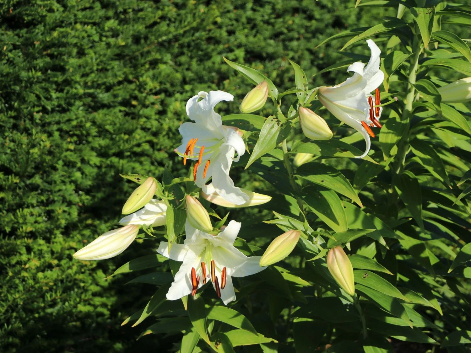 Die strahlende Blütenfarbe der Lilie ‚Casablanca‘ leuchtet im Garten auffällig und sticht jedem Gartenbesucher sofort ins Auge. Die als sternförmig bzw. strahlenförmig beschriebenen Blüten sind groß und prachtvoll. Zu der schneeweißen Farbe der attraktiven Blüten, gesellt sich das sattgrüne Laub der Pflanze, dessen Blätter lanzettlich wirken. Eine besondere Eigenart der Pflanze ist, dass sie direkt nach der Blütezeit ihre Stängel und Blätter schützend einzieht. Die Lilie ‚Casablanca‘ zeigt sich also im Garten komplett in der Zeit von Juni bis Juli.