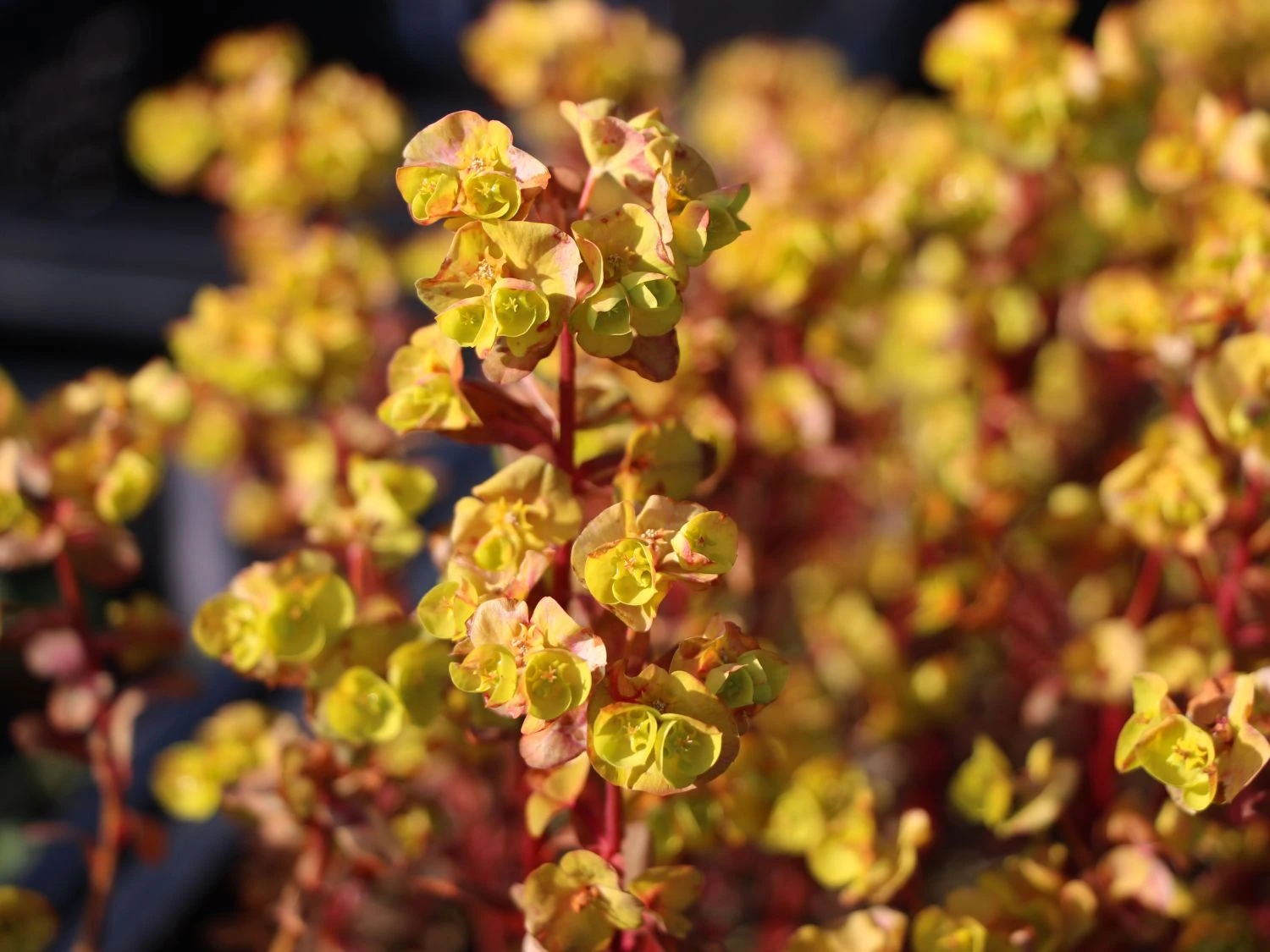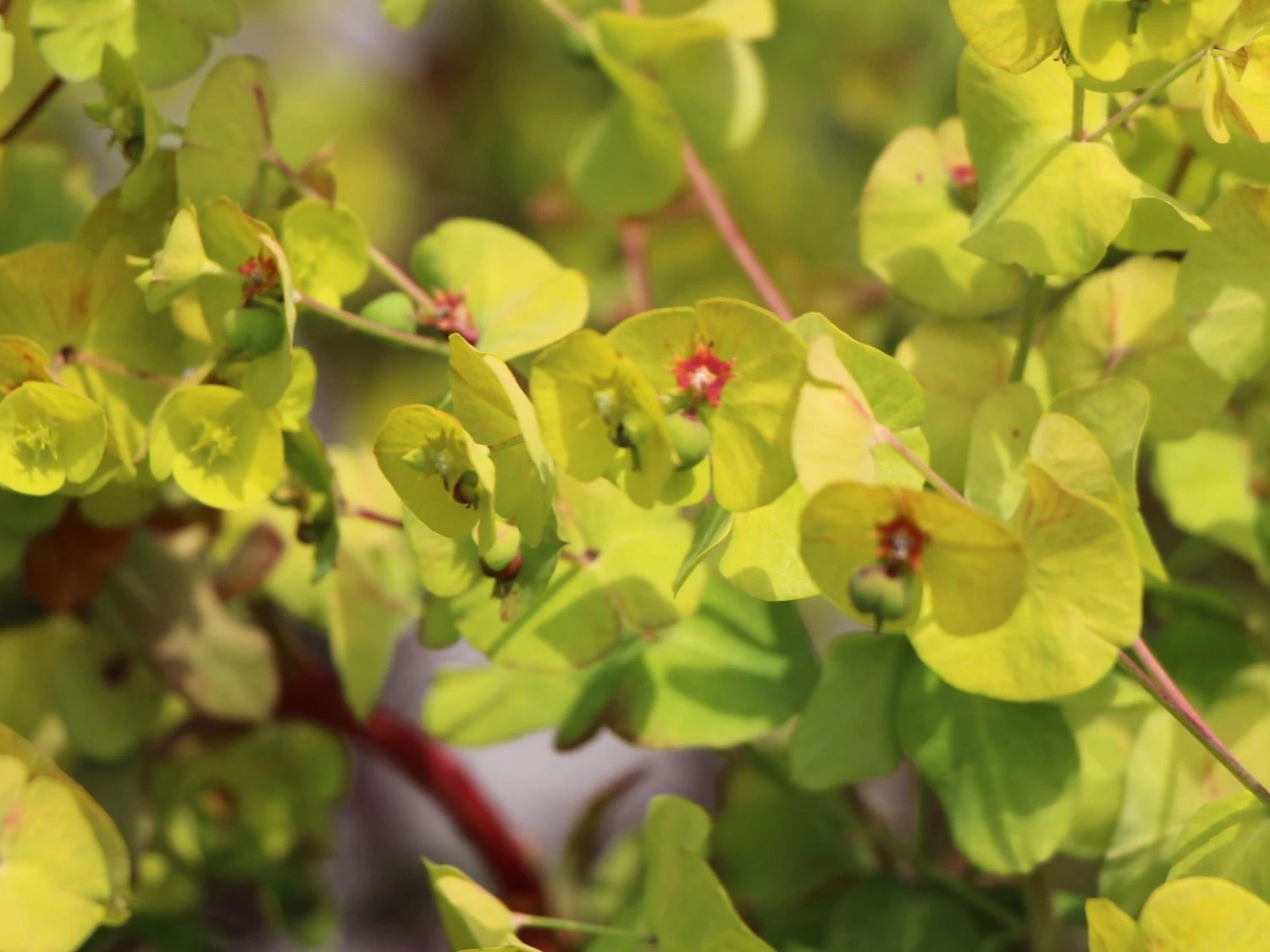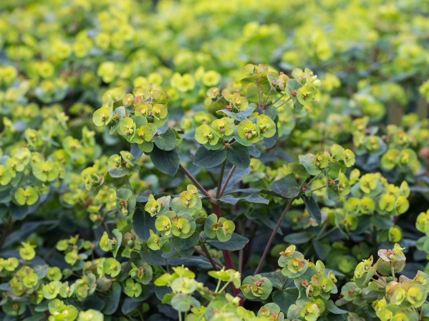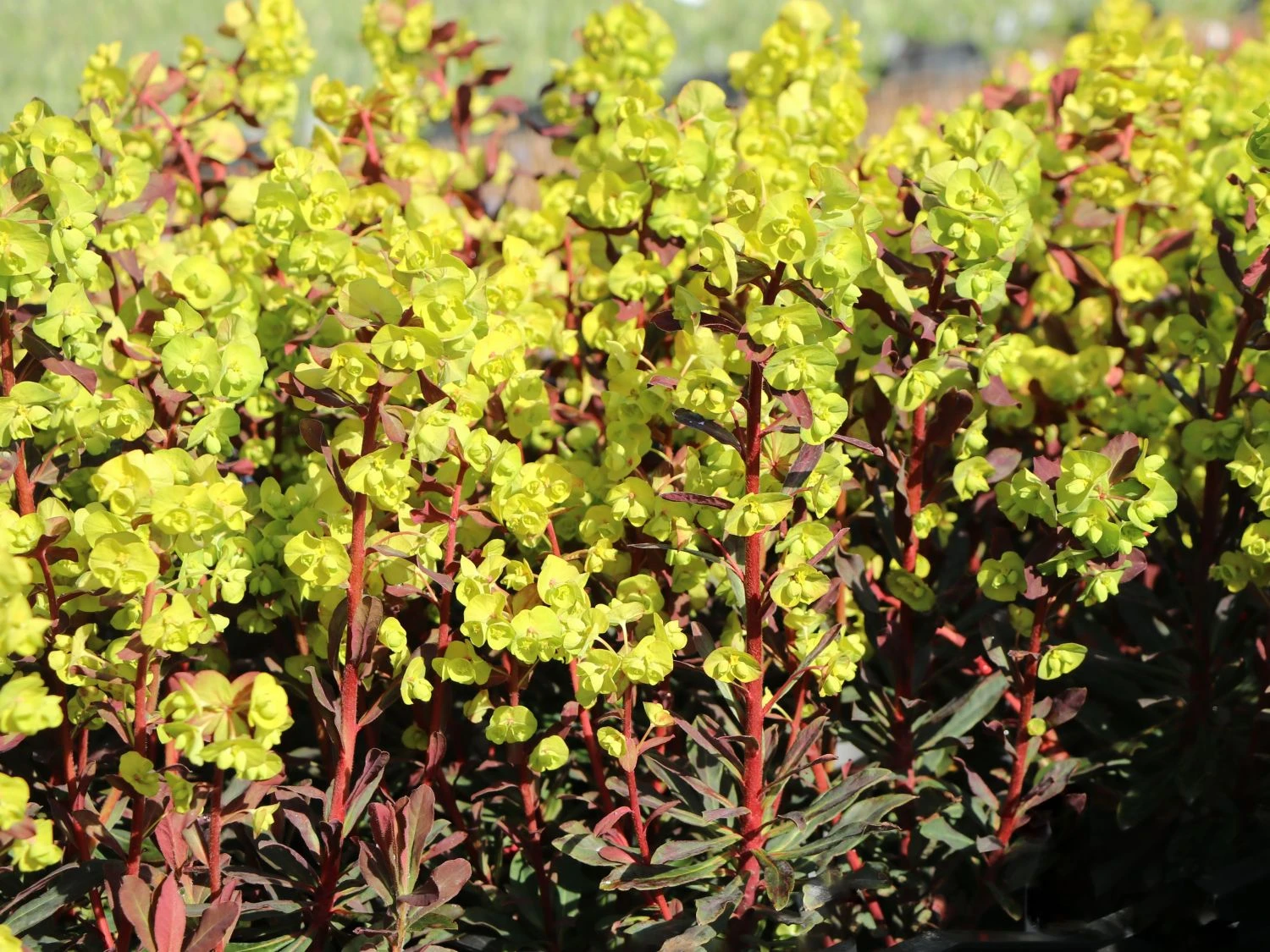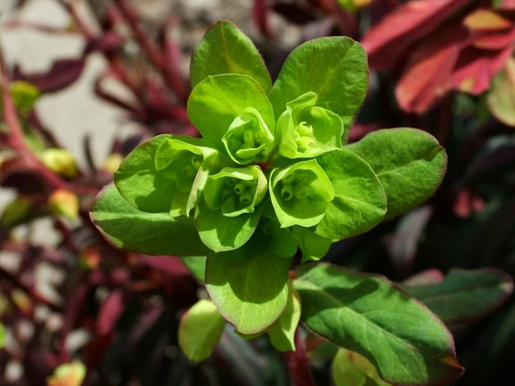 Diese zu allen Jahreszeiten dekorativ wirkende Staude, zählt zu den Wolfsmilchgewächsen und fällt durch die überaus auffällige Farbgestaltung auf. Die Rotblättrige Wolfsmilch ‚Purpurea‘ (bot. Euphorbia amygdaloides ‚Purpurea‘) blüht von April bis Juni gelbgrünlich. Die kleinen, einfachen Blüten heben sich kontrastreich von den braunroten bis purpurrot gefärbten Blätter ab. Die Hochblätter sind gelbgrünlich ausgeprägt. Bereits im Frühjahr leuchten die Triebspitzen in weinroter Farbe. Die unteren Blätter erscheinen in einem satten Braunrot. Auch nach der Blütezeit ziert die Euphorbia amygdaloides ‚Purpurea‘ den Garten farbenfroh. Im Winter sorgen die purpurroten Blätter für ein buntes und schönes Erscheinungsbild. Die Blattfarbe ist verantwortlich für den Namen der Pflanze. Ein Rückschnitt ist nicht nötig. Falls dieser doch einmal erfolgen muss, sind Handschuhe zu tragen, denn der Pflanzensaft ist giftig.