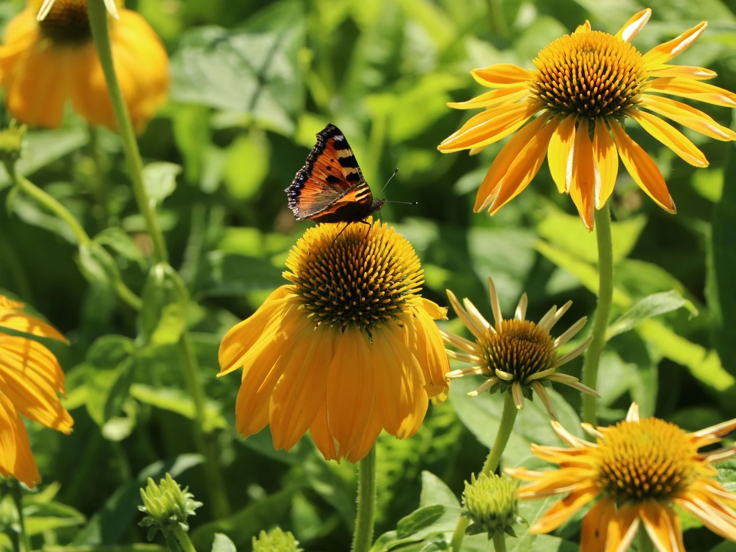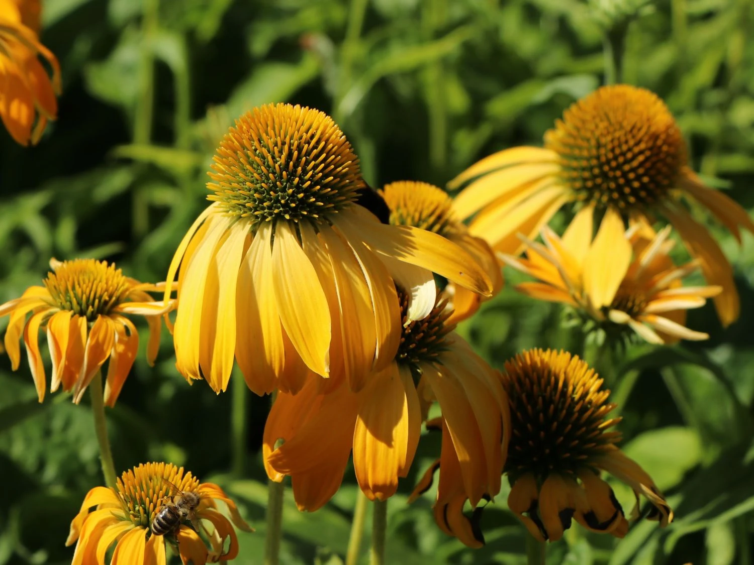 Scheinsonnenhut ‚Prairie Blaze Yellow‘ ist ein wahrer Insektenmagnet. Hummeln und Bienen erfreuen sich an dem Nektar der Pflanze und fliegen diese vermehrt an. Die wunderschönen Blüten erstrahlen in einem leuchtenden Gelb. Ab Juli ist das Schauspiel der tellerförmigen Blüten zu genießen. Die lange Blütezeit macht diese Pflanze so begehrt, denn sie zeigt ihre Blüten bis Oktober. Ein lanzettliches, kräftig grünes Laubwerk rundet die Optik von Echinacea ‚Prairie Blaze Yellow‘ (botanisch) ab. Der aufrechte und kompakte Wuchs dieser Staude macht sie attraktiv als Gruppenpflanze und als Schnittblume. Ihre Anspruchslosigkeit gegenüber der Bodenverhältnisse ermöglicht es, sie in einen Steingarten zu setzen.