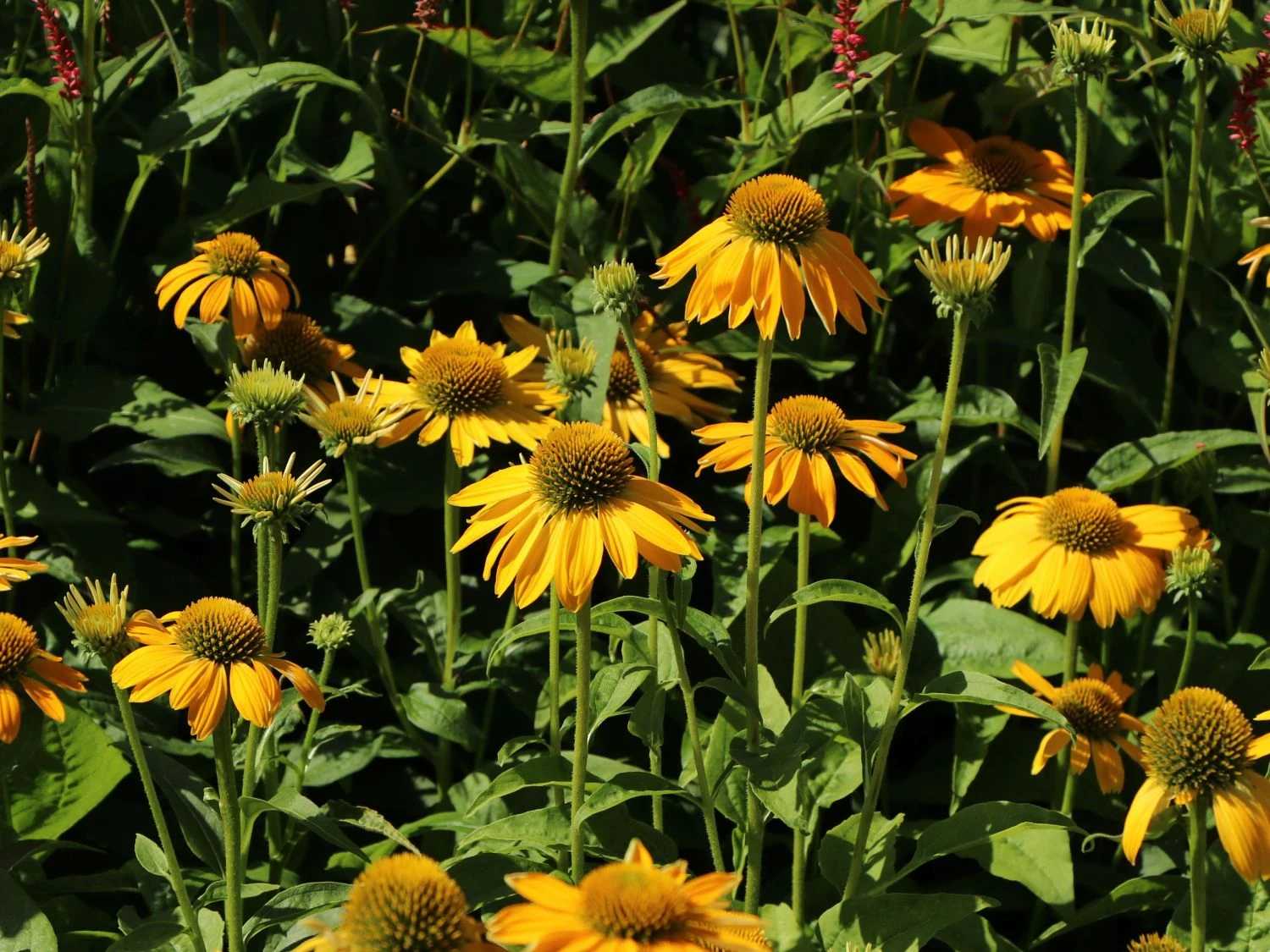 Scheinsonnenhut ‚Prairie Blaze Yellow‘ ist eine blühfreudige Sonnenanbeterin und erhält, wie der Name vermuten lässt, idealerweise einen Platz in der Sonne. Der Boden darf normal ausfallen. An diesen hat sie keine besonderen Ansprüche. Echinacea ‚Prairie Blaze Yellow‘ (bot.) erreicht mit ihrem Wuchs eine Höhe von circa 40 bis 50 cm. In der Breite zwischen 30 bis 40 cm. Ein wunderschöner Anblick in den Beeten ergibt sich mit abgestimmten Pflanzpartnerinnen. Sehr schön wirken Ruten-Hirse oder die Kleinblütige Bergminze in der Nachbarschaft. Staunässe mag Scheinsonnenhut ‚Prairie Blaze Yellow‘ nicht gern, besser ist ein regelmäßiges Gießen, sodass der Boden zwischenzeitlich auch wieder gut trocknen kann. Die Staude Echinacea ‚Prairie Blaze Yellow‘ (bot.) zieht sich in der kühlen Jahreszeit zurück und treibt jedes Jahr aufs Neue frisch und kräftiger aus.