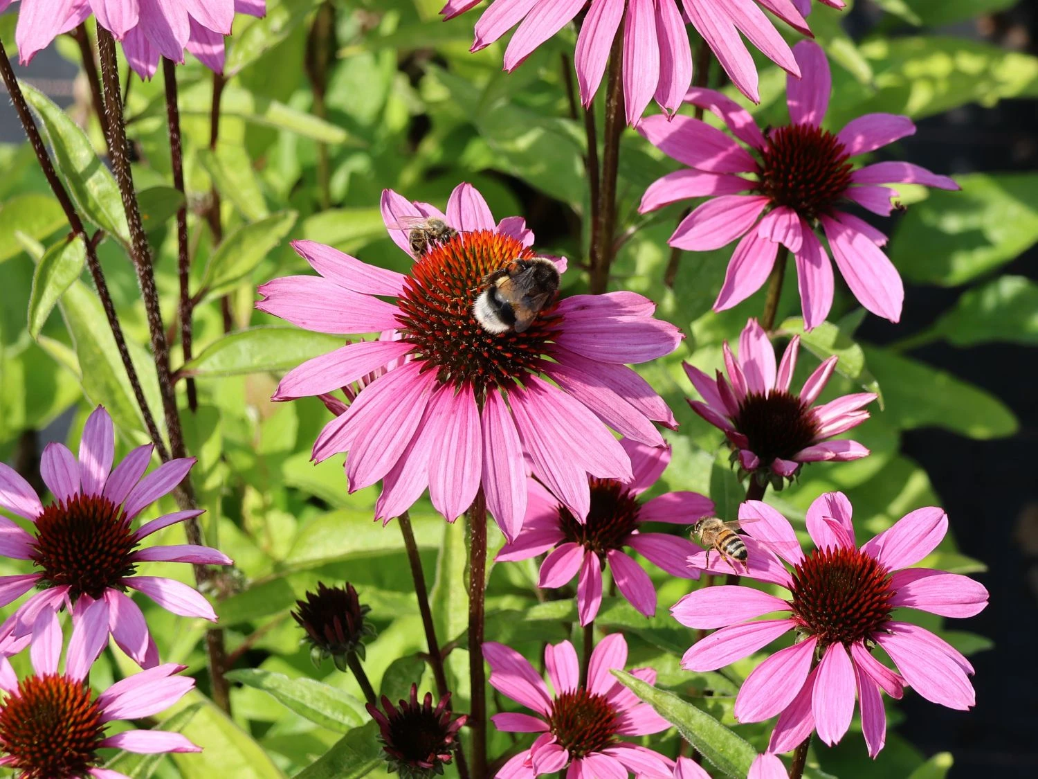 Der Scheinsonnenhut ‚SunMagic Vintage Fuchsia‘ ® begeistert in der Zeit von Juli bis September mit seinen wunderschönen Blüten, die in einem intensiven Fuchsia leuchten. Die einzelnen Blüten stehen am oberen Ende der dunkelgrünen Stängel und sorgen für einen atemberaubenden Anblick. Unzählige Blüten erscheinen während des Sommers und (bot.) Echinacea purpurea ‚SunMagic Vintage Fuchsia‘ ® belebt damit das Staudenbeet oder auch den Kübel auf dem Balkon oder auf der Terrasse. Die Pflanze ist gut verzweigt und wächst nicht sehr hoch, damit ist der Scheinsonnenhut ‚SunMagic Vintage Fuchsia‘ ® perfekt für die Bepflanzung von Kübeln oder als bezaubernder Farbklecks in kleineren Gärten. Während die intensive Farbe der Blüten für eine großartige Optik sorgt, locken die einfachen Blüten auch Bienen, Hummeln und andere Insekten an, die sich vom feinen Geruch des Nektars angezogen fühlen. Um die Blütezeit noch zu verlängern, lohnt sich die Mühe, verblühte Blütenstände regelmäßig zu entfernen. Der Sonnenhut ist seiner natürlichen Umgebung an trockene und sonnige Bereiche gewöhnt, daher stellen ein paar Tage ohne Regen – auch an einem sonnigen Standort – für die Pflanze keine große Herausforderung dar.