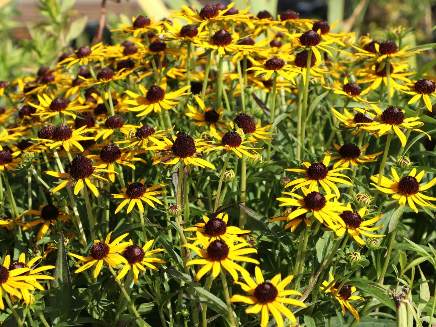 Im Juli beginnt der Sonnenhut ‚Early Bird Gold‘ den Garten mit seiner tiefgelben Blütenpracht zu verzaubern. Er ist eine beliebte Pflanze, um Gärten bienenfreundlich anzulegen. Den ganzen Sommer hindurch laben sich unzählige Bienen an seinem Nektar. Auch viele Schmetterlingsarten und Hummeln wählen ihn gern als Landeplatz aus. Die Rudbeckia fulgida ‚Early Bird Gold‘ ® erfreut das Auge den ganzen Sommer lang bis weit in den Herbst hinein. In manchen Jahren erhellt sie sogar trübe Septembertage mit ihren leuchtenden Blüten. Der Sonnenhut ‚Early Bird Gold‘ ® ist eine robuste Sorte, die keine hohen Ansprüche an ihre Umgebung und Pflege stellt. Als Beetstaude oder auf der Freifläche liebt sie eine warme, sonnige Stelle. Auch am Gehölzrand bevorzugt sie einen Platz an der Sonne. Der Boden sollte frisch und normal durchlässig sein, ideal ist ein neutraler pH-Wert. Als robuste Sorte benötigt die Rudbeckia fulgida ‚Early Bird Gold‘ wenig Pflege. Im Herbst oder Spätherbst ist nach dem Abblühen ein starker Rückschnitt erforderlich. Dieser erfolgt bis zum grundständigen Blattschopf. Nach der Winterruhe erfreut der Sonnenhut ‚Early Bird Gold‘ ® im nächsten Sommer wieder das Auge des Gartenliebhabers.