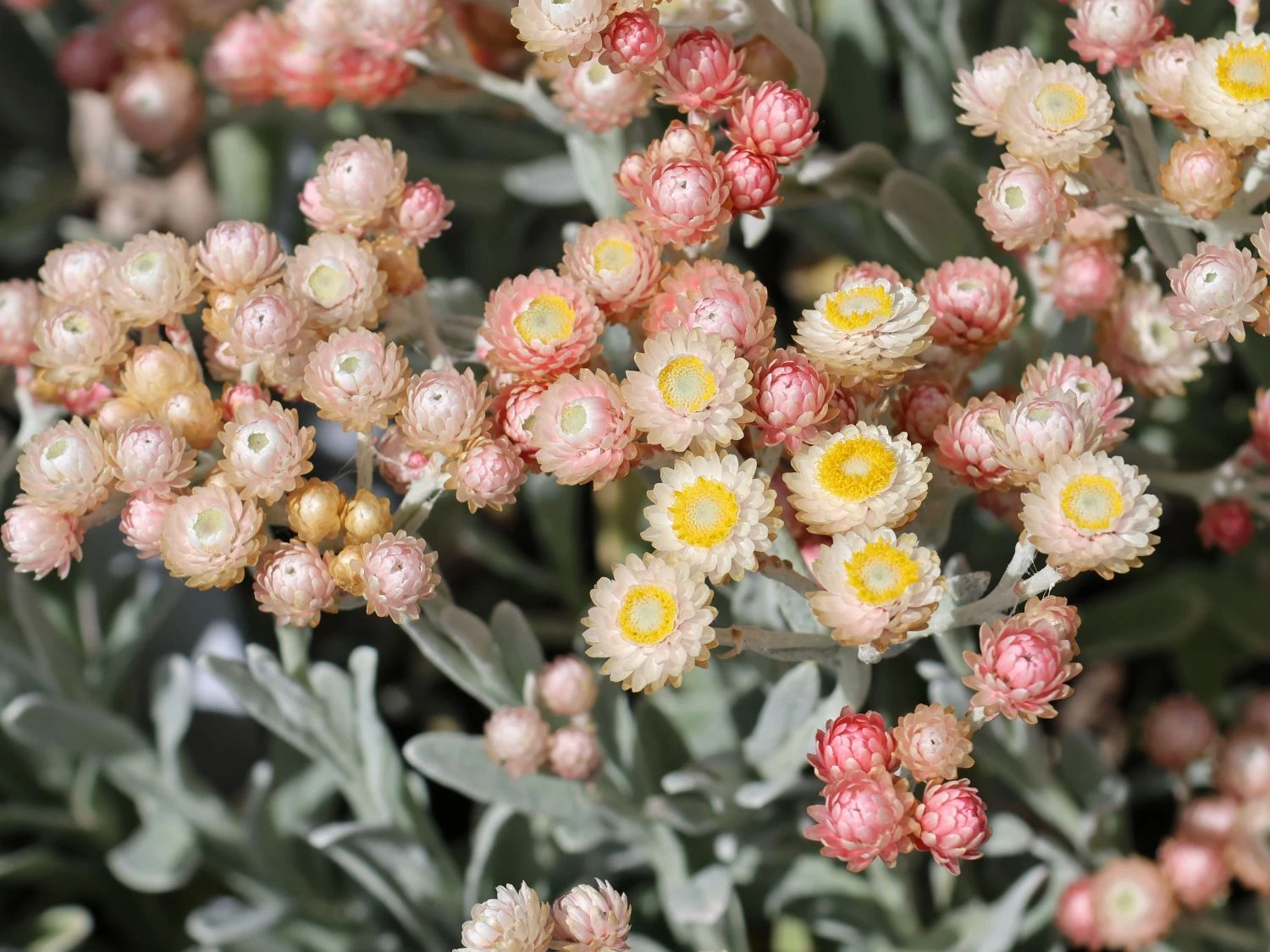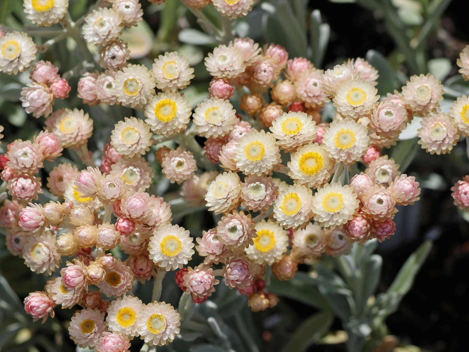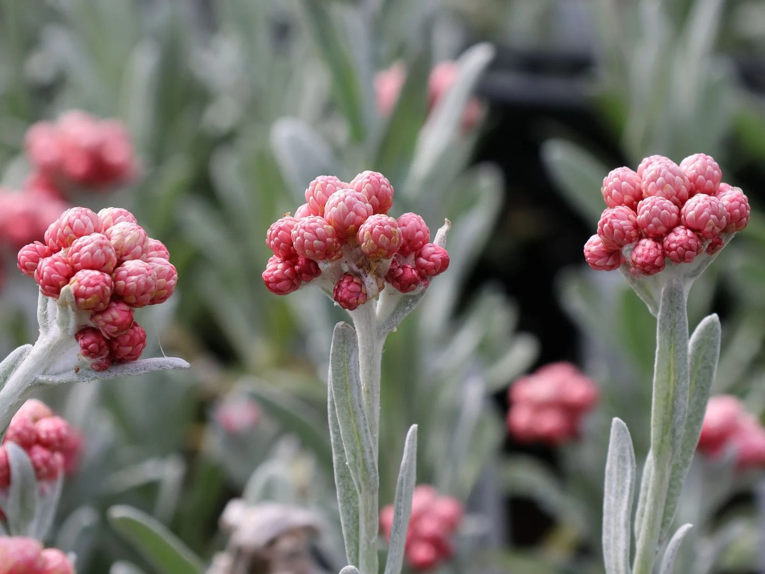 Die Strohblume ‚Ruby Cluster‘ ist eine großartige Staude, die mit ihren leuchtenden Blüten und dem dekorativen Laub entzückt. Sie zeichnet sich durch eine sehr lange Blütezeit aus. Ihr fantastischer Flor erfreut das Auge von April bis Juli. Die kleinen Blüten treten in Dolden auf. Sie sind kugelig geformt und hellrot bis leuchtend rot gefärbt. In ihrem Aussehen erinnern sie an rote Beeren. Mit der Zeit öffnen sich die Blüten und geben den Blick auf die goldgelbe Blütenmitte frei. Ein wunderschöner Blickfang ist auch das Laub von Helichrysum amorginum ‚Ruby Cluster‘. Die Blätter sind länglich, lanzettlich geformt und vorn abgerundet. Sie schimmern in einem eleganten Silbergrau. Da sie wintergrün sind, setzen sie in der vegetationsarmen Jahreszeit attraktive Akzente im Garten. Die Strohblume ‚Ruby Cluster‘ wächst aufrecht, buschig und horstbildend. Sie erreicht eine Höhe von 15 bis 30 Zentimeter. Mit einer Breite von 30 bis 40 Zentimeter wird sie wesentlich breiter als hoch.